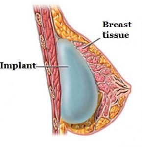 BIA-ALCL is not a cancer of the breast tissue but a type of lymphoma. Breast implants are inserted behind the breast tissue or under the chest muscle (see photo). A fibrous scar called a capsule then develops around the implant, separating it from the rest of the breast. Cases of BIA-ALCL have typically been found adjacent to the implant and contained within that fibrous capsule.